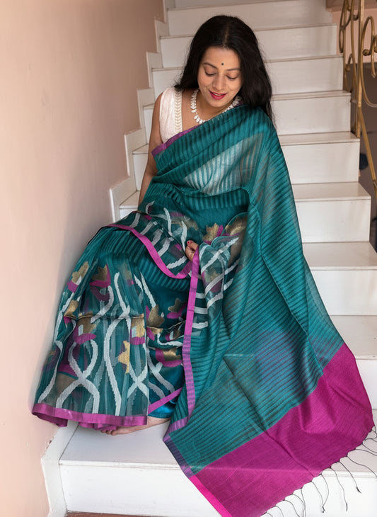 SARASWATI : SILK LINEN SAREE WITH LOTUS