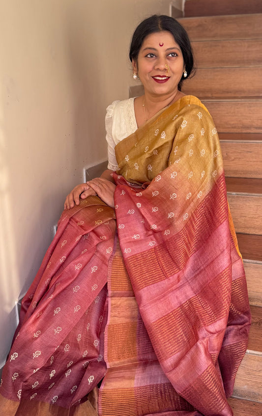 SURUCHI : SHADED TUSSAR SILK SAREE WITH BLOCK PRINT ZARI BORDER