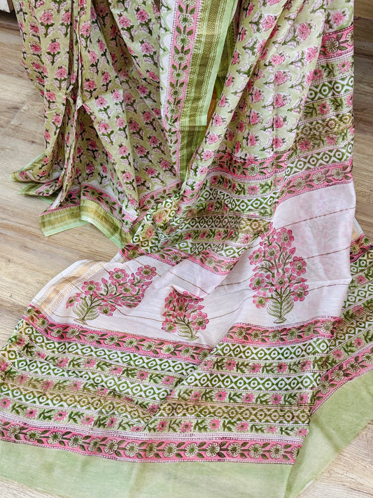 HARITHA : HAND BLOCK PRINTED MAHESHWARI SILK COTTON SAREE