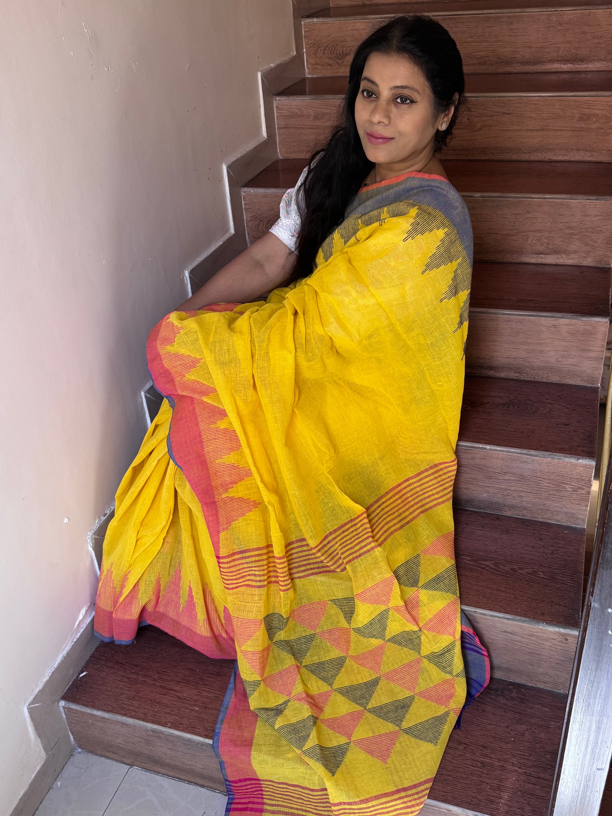 Experience timeless elegance with this pure linen Jamdani saree, a testament to refined craftsmanship. Woven in premium 85-count quality, it features intricate temple motifs adorning the borders with graceful precision. The pallu showcases stunning triangular geometric patterns meticulously crafted with zari and gicha threads, blending traditional artistry with contemporary sophistication. The delicate, fine weave ensures comfort while maintaining the saree's luxurious drape, making it an ideal choice for special occasions where heritage and elegance converge.