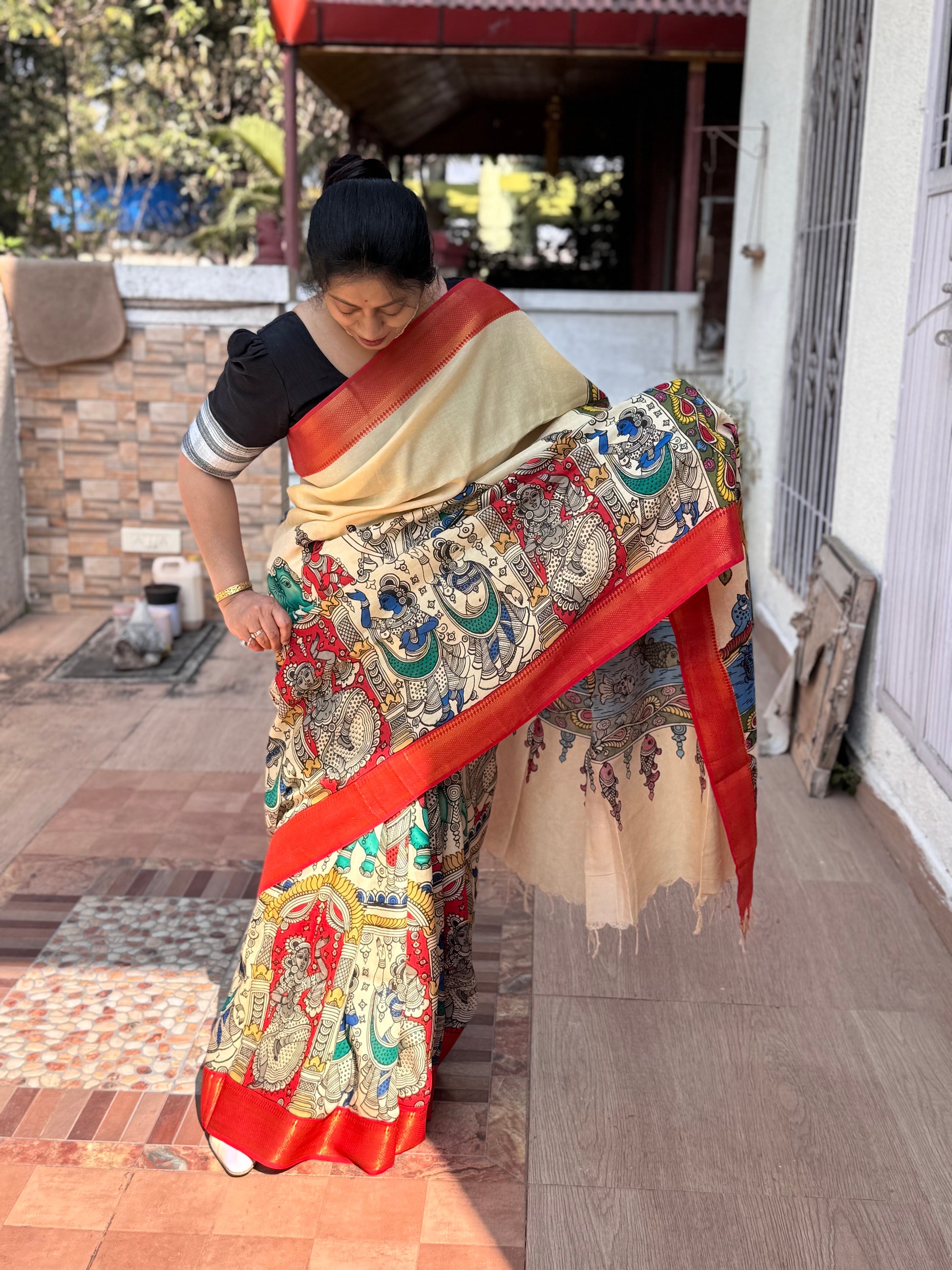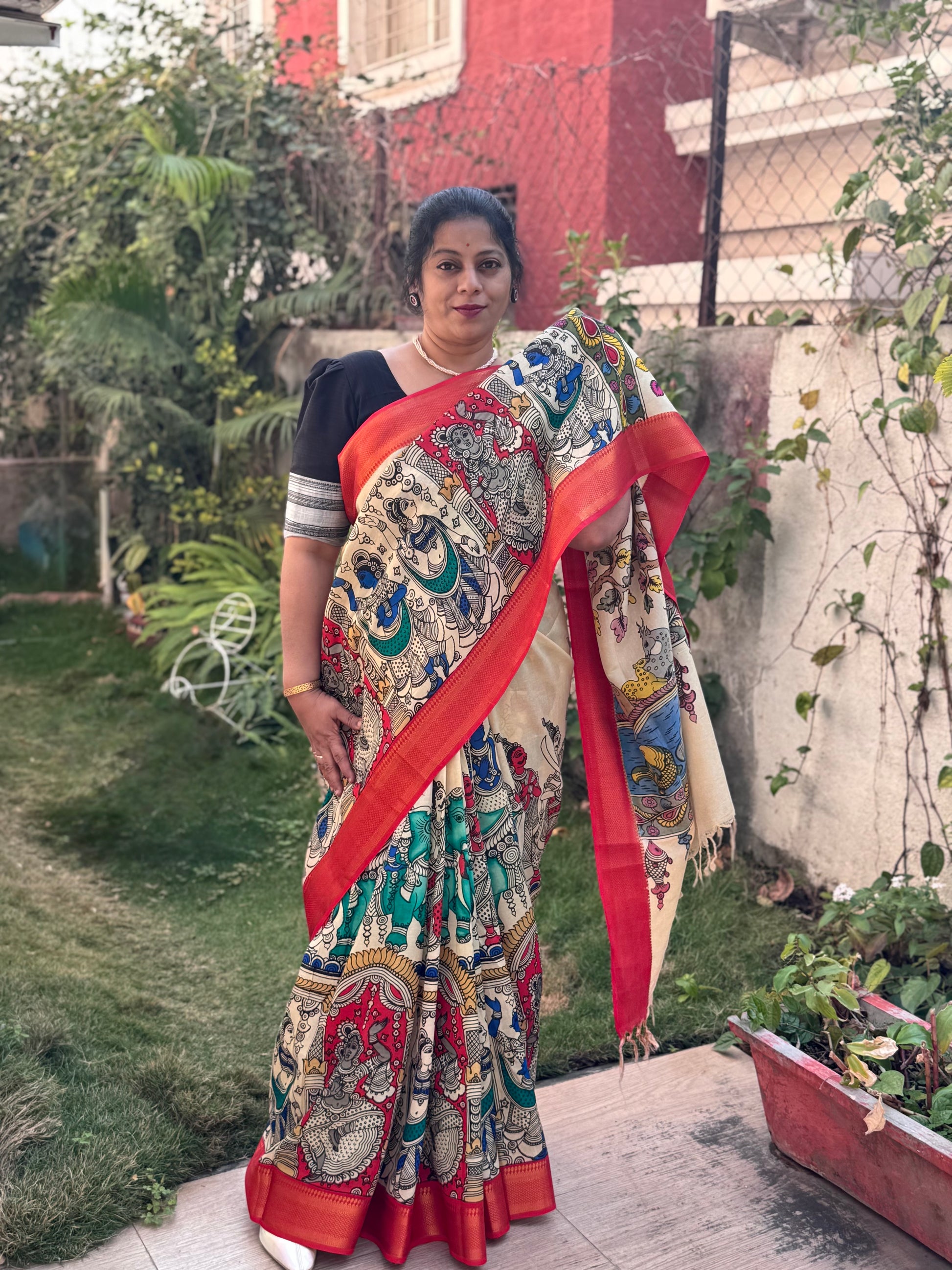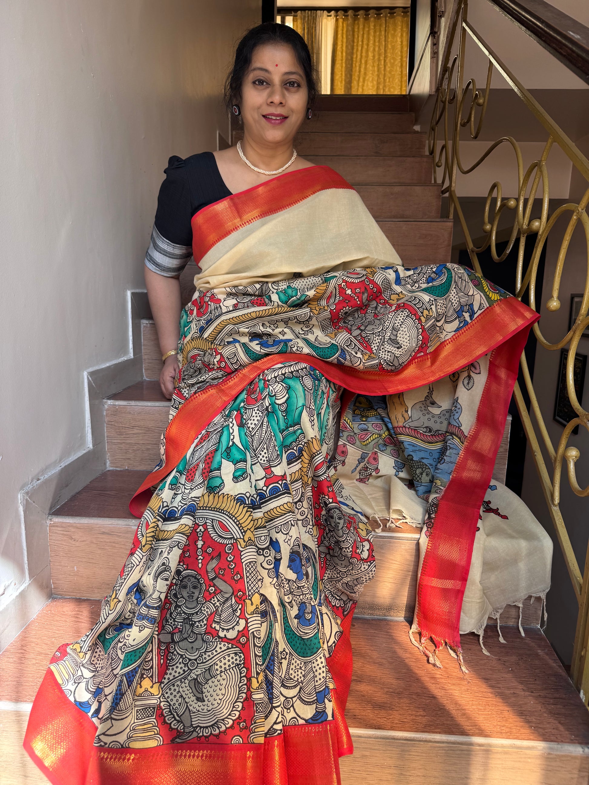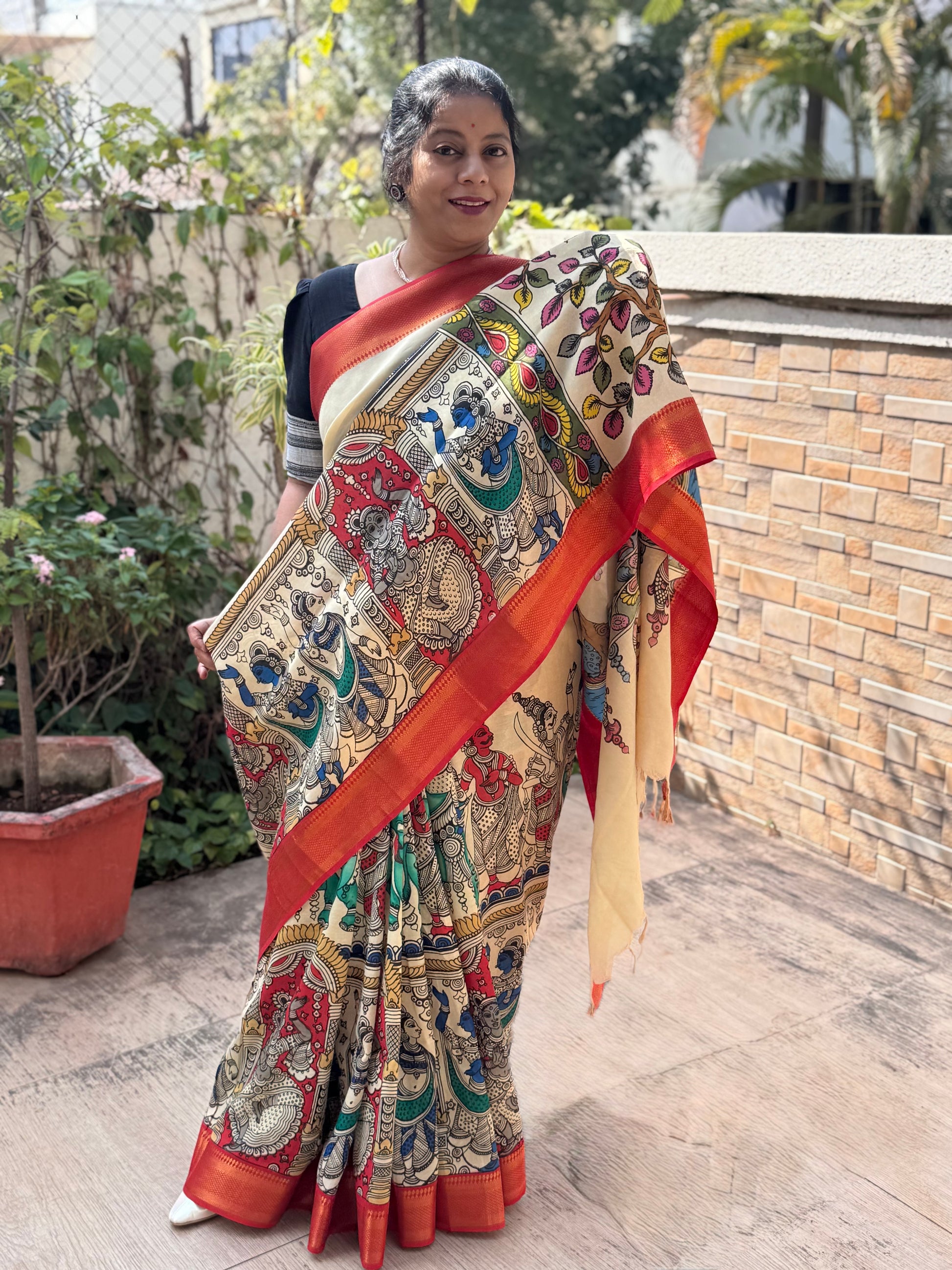 This beautiful Pen Kalamkari saree from Srikalahasti is a treasure to behold. Hand painted on Bangalore silk, this saree is soft and easy to carry. It has some lustre and can be a great wear for special occasions. Blouse piece is hand painted as well.